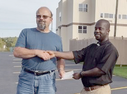 Iron River Knights of Columbus Council 2300 made donations toward parking lot repairs at two local Catholic churches, providing crack fill, sealing and striping. Grand Knight Mark Stauber, left, hands parishes priest Father Dan Fosu checks in the amount of $4,500 for the parking lot at St. ...