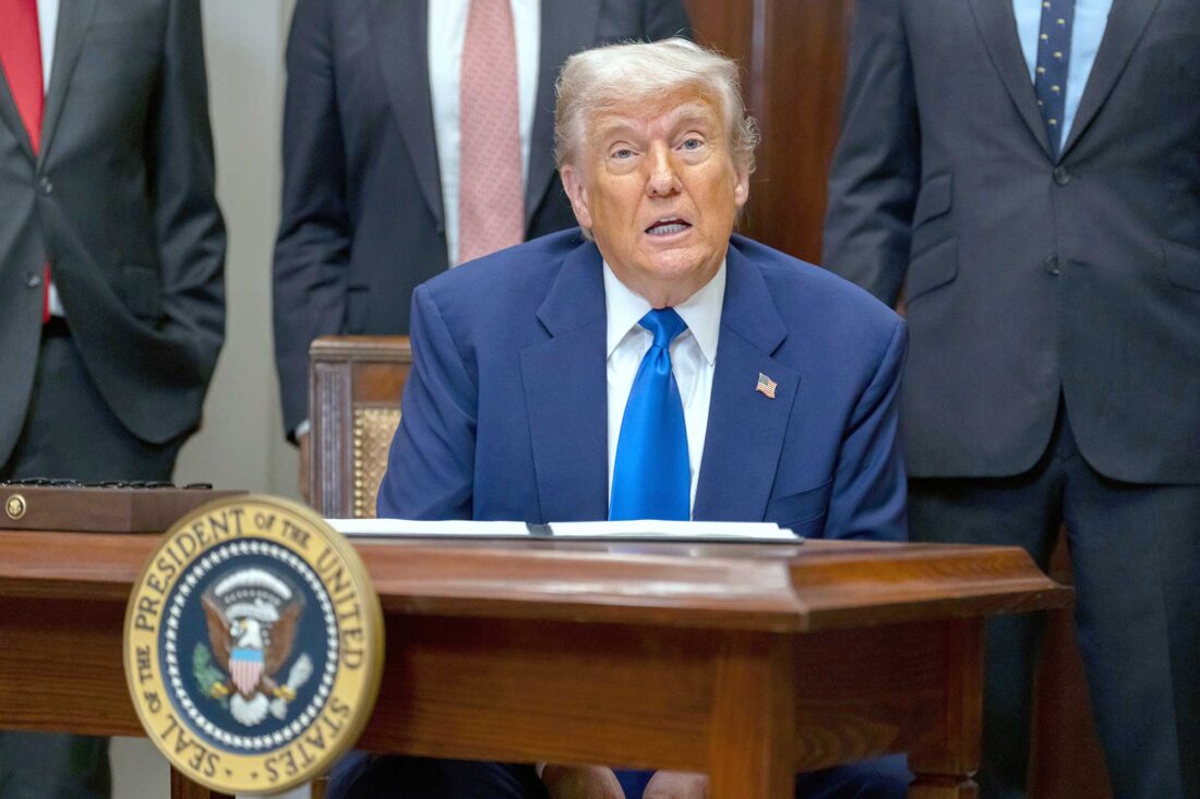 PRESIDENT DONALD TRUMP answers a reporter's question Monday during an event in the Roosevelt Room at the White House in Washington. (AP Photo/Mark Schiefelbein)
