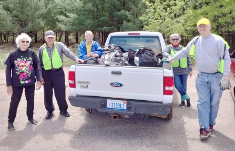 Golden K members participated in their annual road clean up on Monday. Pictured at left, are crew volunteers from left Joan Jouppi, Ron Jouppi, Paul Ward Louise Swope and Gilbert Engel chairman of road cleanup behind him. Not pictured are Kathy Jo Anderson, Bill Roberts, Charlie Younts and Richard Jouppi.