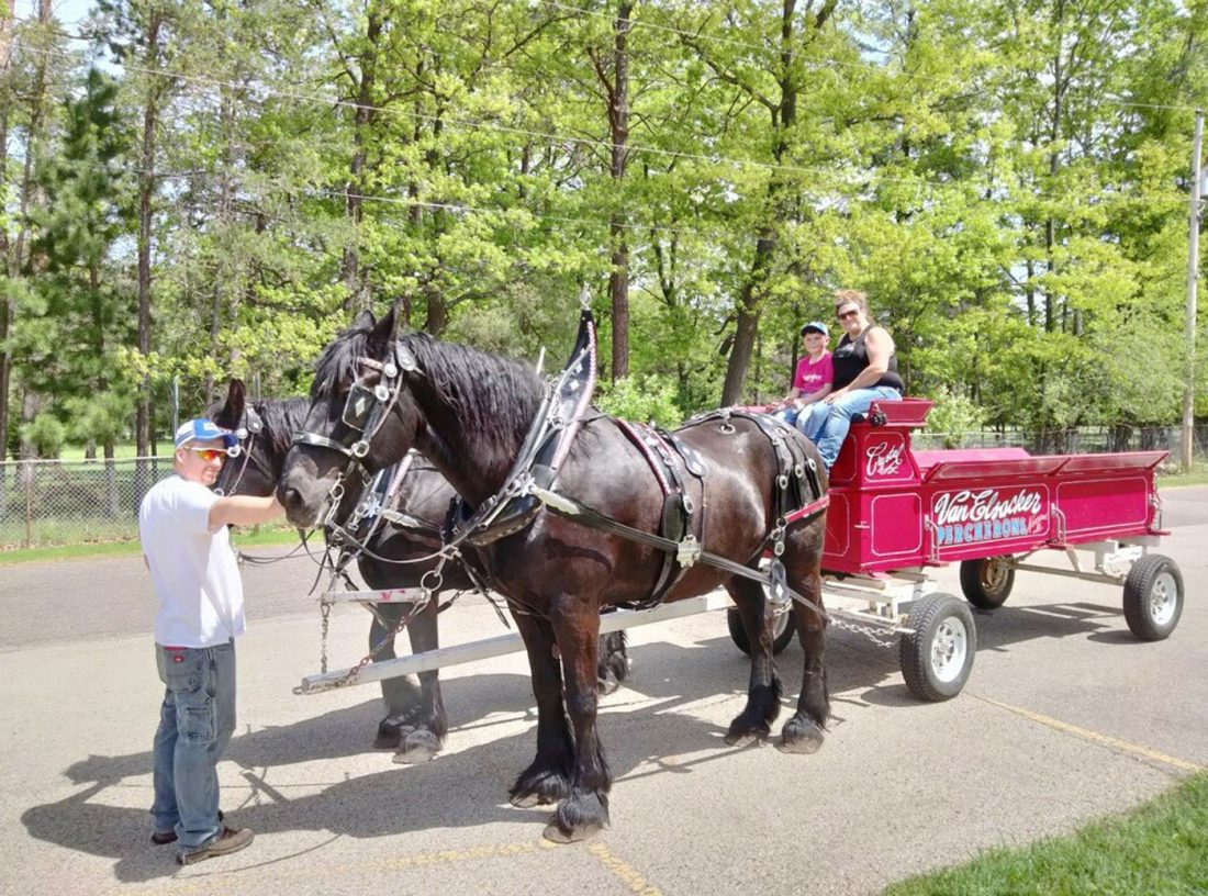 Three people from the Van Elsacker Farms brought their horses and wagon just for the kids. Crystal Van Elsacker, Andy Jaeger and Lyman Tucker loaded up the kids for rides around City Park in Iron Mountain. Van Elsacker Farms made a lot of students very happy. A few seniors got the chance to jump on for a ride.