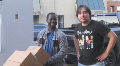 - Darin Long and Grand Knight Mark Stauber move items from the back of a truck into the new Iron River St. Vincent de Paul store.