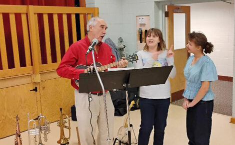 Musician Jim Janofski with students Harley Sturm Jones and Trinity Sanders from Norway Middle School at Golden K’s annual Valentine’s party for special needs children.