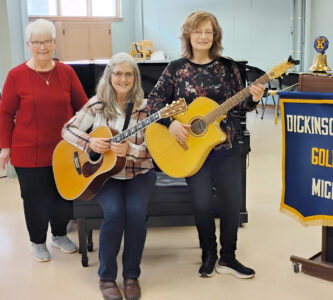 Golden K chair Sue Proudfit introduces guest performers Dickinson County Community Chorus Director Crystal Hogan and Community Chorus Assistant Director Dawn Kranz. (Submitted photo)