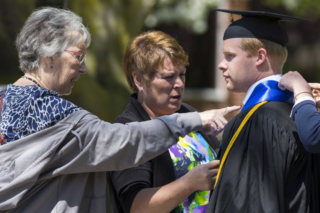 Gwen Osterberg Altmann, center, formerly of Aurora, Wis., adjusts the robe of Niklas Rosander of Sweden prior to commencement Sunday at St. Norbert College in De Pere, Wis. At left is Rosander’s grandmother, Elsy Rosander of Sweden. The Altmann family resides in Milladore, Wis., and son Tony, a 2016 graduate of St. Norbert, befriended Niklas Rosander, who became a big part of the family.