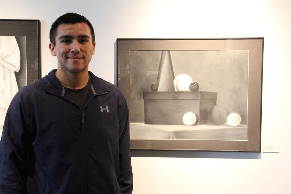 Bay College student Justin Larson with his charcoal drawing, “Still Life.”