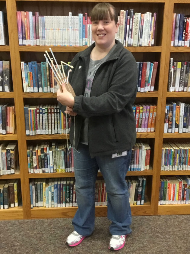 Emily Cummings, middle grades/adolescent literary specialist at the Dickinson County Library, displays a “robotic arm” kids can make during this month’s Odyssey Seekers Club program Saturday at the Dickinson County Library in Iron Mountain.