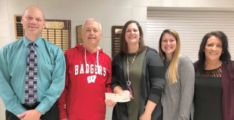 The Niagara Public Schools special needs program representatives accepts a check from the Knights — from left are Terry Hanson, director of pupil services; Dan Decker, Knight treasurer; Angela Koprowski and Courtnee Wickman, special education teachers; and Sherri Champagne, first-grade teacher.