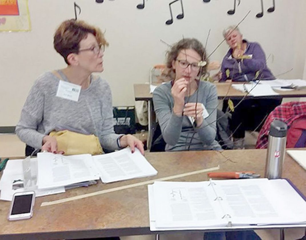 Photo by Rebecca Krans, MSU Extension During face-to-face trainings in 2019, Extension Master Gardeners — from left, Erin Minne, Amalia Anderson and Hilary Sproule — label the correct parts of a branch. Similar activities will be available and adapted for online participants.
