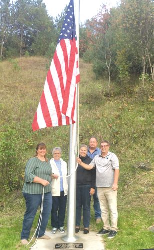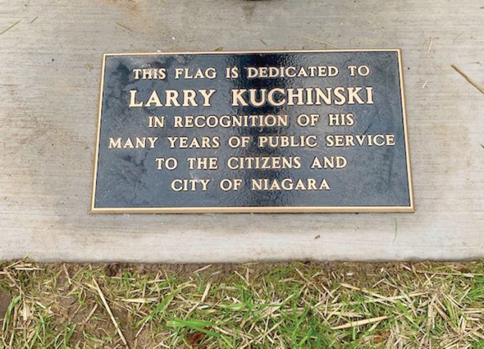 A flag dedication took place in September to honor the late Larry Kuchinski Sr., a longtime Niagara, Wis., city councilman and village trustee. In the top left photo, George Bousley presents a flag to Kuchinski’s widow, Helen. Bousley served with Kuchinski for many year on the city council and village board. At lower left is the plaque at the base of the flagpole. Above right is Kuchinski’s family — from left, daughter Karen Rock, Helen, daughter Donna Moreau and sons Jerry and Larry Jr. Other family members present at the dedication included his grandchildren. The flagpole is at the base of the hill just off U.S. 141 near the artificial waterfall.
