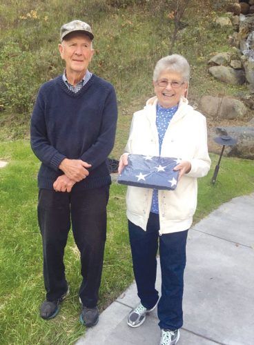 George Bousley presenting a flag to Helen Kuchinski.