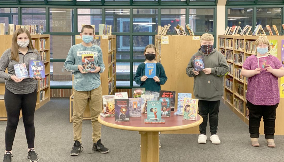 The Dickinson County chapter of Michigan Association of Retired School Personnel awarded a $125 mini-grant earlier this school year to Patti Milinski, Kingsford Middle School librarian. The grant was used to purchase several books for the Kingsford Middle School Media Center that are now available for students to enjoy. MARSP, which is an organization comprised of retired school personnel, is proud to provide these grants to area teachers to help them purchase materials that, due to budgetary restraints, might otherwise not be available to students. For more information on MARSP, go to the group’s website at www.dcmarsp.webs.com. From left are Kingsford Middle School students Adelyn Normand, Edward Chaperon, Cady Brown-Norman, Kyle Blazier and Myah Hood.
