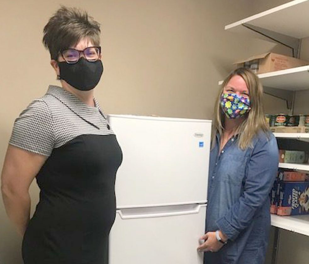 Bay College West instructors Crystal Hendrick, left, and Britt Slade display the new refrigerator purchased by the Michigan Education Association for the student food pantry.
