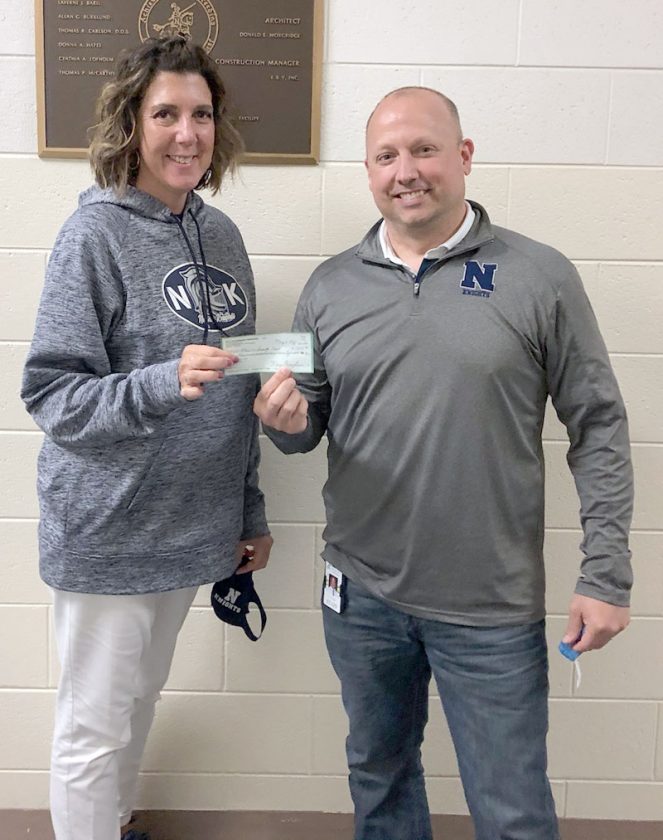 The Norway Athletic Booster Club is selling 50-50 drawing tickets toward refurbishing the fitness center. Rico Meneghini, right, son of the late Lee Meneghini, presents a $3,975 check to Rae Anne Seat, Norway Athletic Booster Club president, to lead off the effort. Tickets can be purchased at the school for $10 each, from any coach or Booster Club member or at these businesses: The Knight Owl, Mister Mom’s, The Thirsty Whale, The Longbranch Saloon, CarQuest Auto Parts and Bimbo’s Wine Press. Lee Meneghini was an avid supporter of Norway High School athletics who often could be seen at local sporting events with a bag of popcorn in his hand, cheering on the teams.
