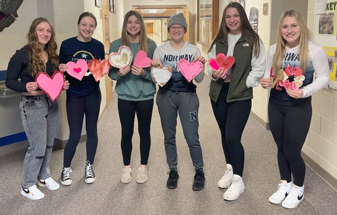 The Norway High School LEO Club made Valentines to decorate the hall for the veterans at the Oscar G. Johnson VA Medical Center. From left are Gabrielle Leiker, Karly Masselink, Sage Groeneveld, Sarah Tinkey, Mackenzie Gilroy and Averie Popp.