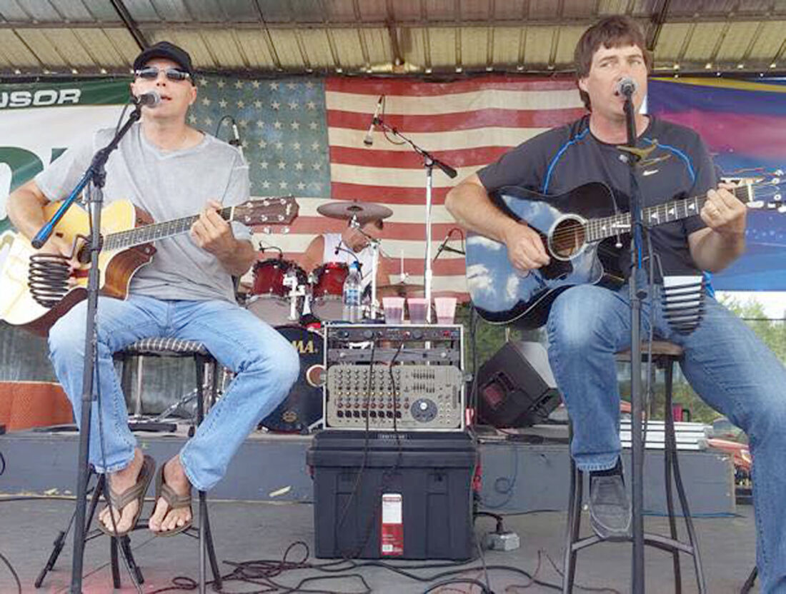 Jim Chartier, left, and Rob Norton, perform Thursday at Music in the Park in Norway.