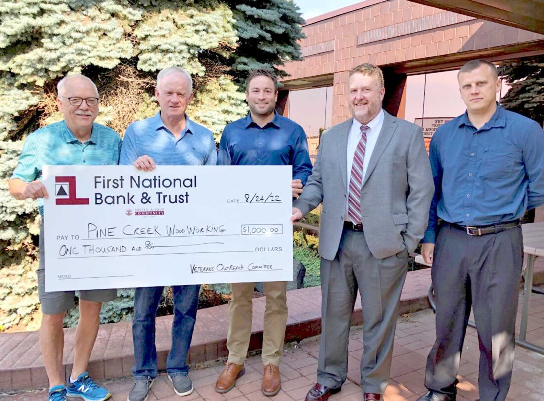 First National Bank & Trust in Iron Mountain made a $1,000 donation to the Pine Creek Woodworking project. From left, Pine Creek Woodworking Board Members Steve Pontbriand and John Fortier; First National Bank & Trust Business Bankers Jake Hogberg and Dale Cook; First National Bank & Trust Veterans Outreach Committee Chair Matt Donovan.