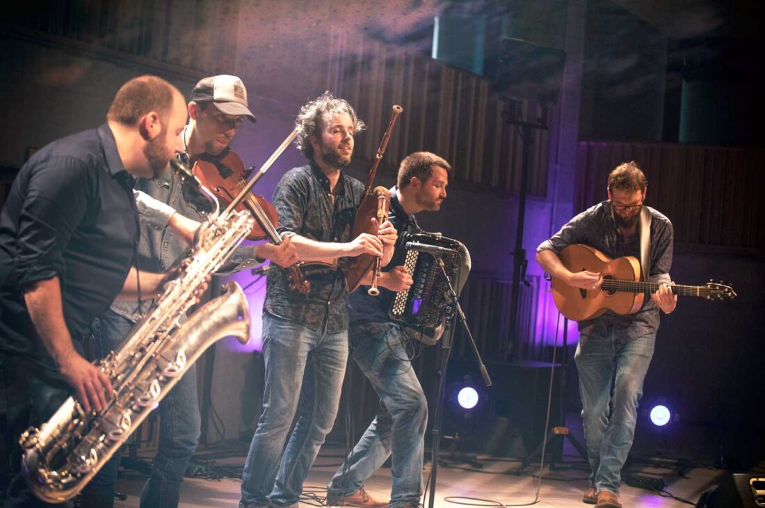 Each member of the band is a serious student of his chosen instrument and has a long experience in a wide range of musical genres. Fabio Di Meo, baritone sax; Jeroen Goegbuer, fiddles, mandolin and banjo; Pieterjan Van Kerckhoven, bagpipes, soprano sax and piano; Bert Ruymbeek, accordion; and Jonas Scheys, guitars and double bass. All experts in their respective fields. With great respect for the traditional music of their homeland, the group breathes new life into ancient, striking melodies.