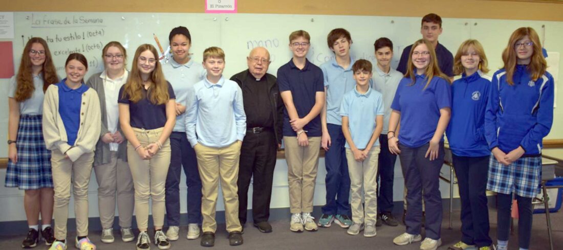 Msgr. Joe Gouin, pastor of American Martyrs Parish, visited seventh- and eighth-grade students at Bishop Baraga Catholic School in Iron Mountain to talk with them about the importance of their faith. He shared some amazing stories from his priesthood, and everyone enjoyed the visit. From left are Sophia Richardson, Elise Cameron, Tessa Vicenzi, Ella Theisen, Riley Couper, Paolo Lenzi, Gouin, Philip Miziniak, Goran Gayan, Evan Rodriguez, Jerzy Raiche, Olivia Sage, Charlie Baldridge, Ehlena Nieschulz and Kaija Hill.