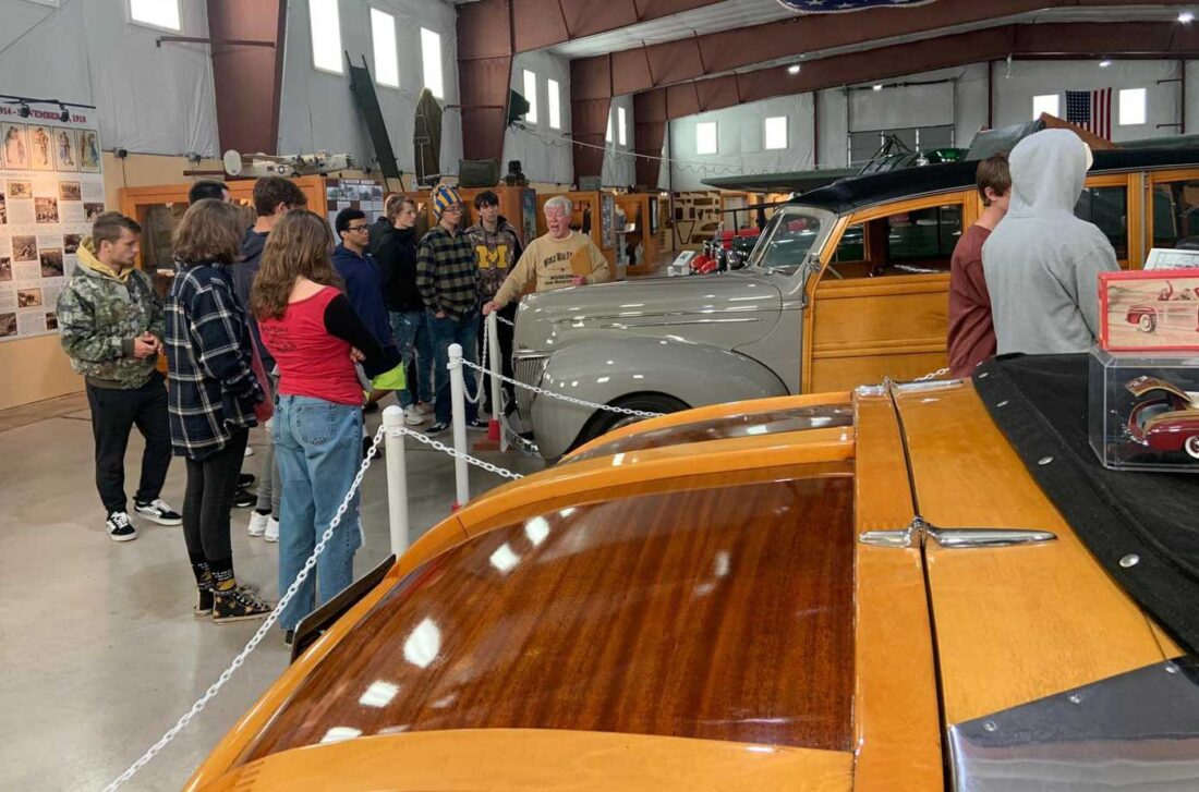 Aaron Yonke photo Sixteen Kingsford High School students from Aaron Yonke’s Upper Peninsula History class toured the Cornish Pumping Engine & Mining Museum and the World War II Glider & Military Museum. Bill Cummings, Menominee Range Historical Foundation president and historian, served as the guide, explaining the role iron mining, logging and lumbering and the Iron Mountain Ford Motor Company Plant in Kingsford played in this area. Cummings stated that providing free tours to area school groups helps fulfill that goal. The museum’s 1939 Ford Deluxe “Woodie” Station Wagon and the trunk of the 1946 Ford “Woodie” Sportsman Convertible are visible at the right. Military uniform displays line the south wall and the tip of the CG-4A glider’s right wing can be seen in the background.