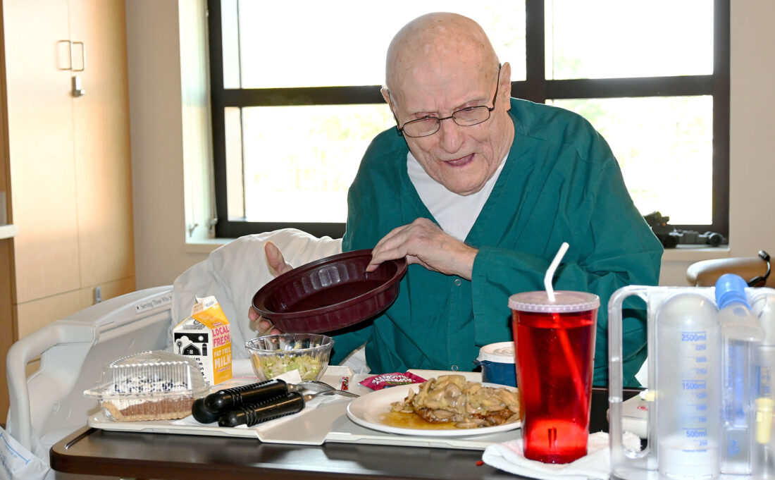 JOHN MODDIE, Oscar G. Johnson VA Medical Center community living center resident and prisoner of war survivor, receives his birthday meal Sept. 9 in his room at the CLC. He turned 97 on Sept. 11. (Oscar G. Johnson VA Medical Center photo)