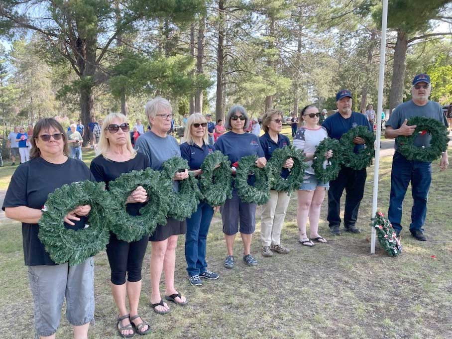 Auxiliary members placed wreaths on the graves of military veterans at the Evergreen Memorial Cemetery in Crystal Falls. From left are Mary Jean Thoresen, Sherry Rajala, Cindy Fabbri, Kitty Brozak, Mary Gagala, Alice Clement, Erin Reinke, Dave Desmith and Frank Angeloff.
