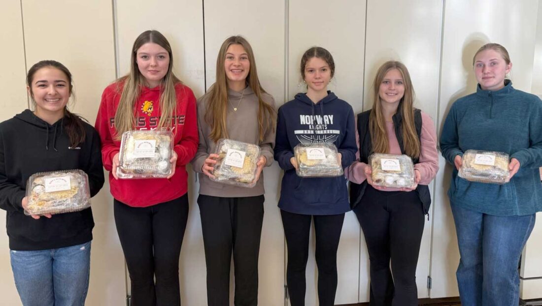 The Norway High School YAC and LEO Clubs assisted the Norway-Vulcan Women’s Club in baking and putting together cookie boxes to deliver to members of the community. Club members, from left, are Ashley Carlson, Tessa Castelaz, Jessa Rossler, Mary Cavagnetto, Kara Stanchina and Tirah Hauswirth.