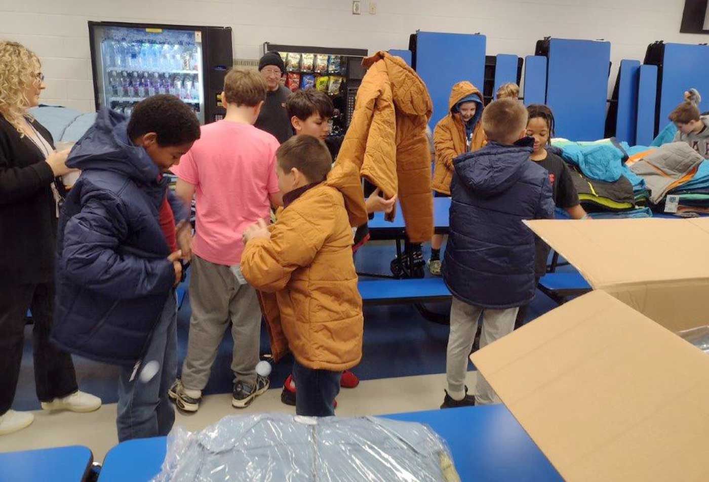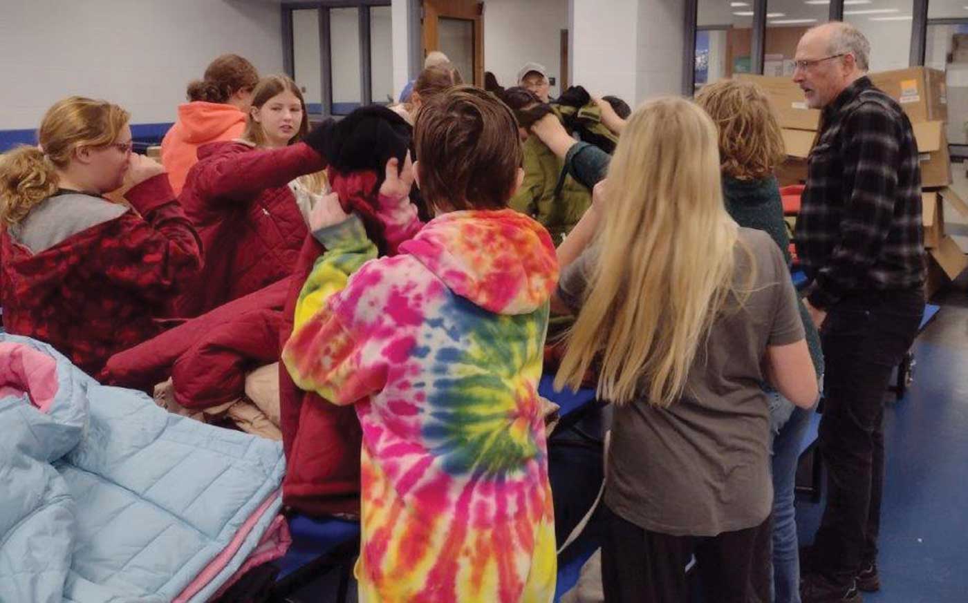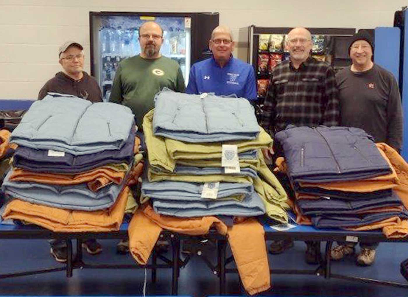 The Iron River Knights Of Columbus Council 2300 recently had its first “Coats For Kids” program at the West Iron County School. The event was chaired by Deputy Grand Knight Dennis Cerney and was assisted by Knights Don Bastianello, Grand Knight Mark Stauber and Tim Peruzzi. One hundred and thirty-three coats were distributed to middle and high school students. The school staff — including Principal Mike Berutti, Kathy Kinner, School Deputy Jeremy Allen, along with other teachers — were very helpful and appreciative of the gifts of coats, as were the recipient students. Cerney expressed his gratitude to all, including his fellow Knights who assisted. In the upper photo, from left are Bastianello, Stauber, Berutti, Cerney and Peruzzi. In the lower photos, students select their coats.
