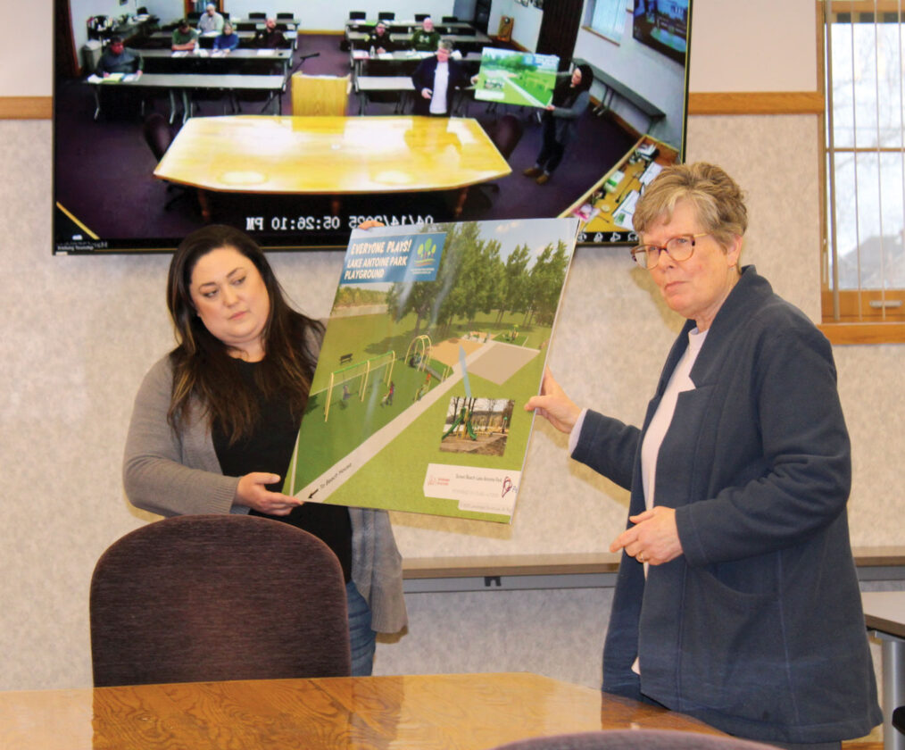 ANN HRUSKA, ABOVE right, a Lake Antoine Park Partners charter board member, was the guest speaker at the April 8 luncheon meeting of the Rotary Club of Iron Mountain-Kingsford. Her powerpoint presentation showed plans for the 501(c)(3) charity to develop Dickinson County’s beachside playground as all-inclusive for ages and mobility levels. She also touched on other projects at the park that benefit visitors. Helping with the presentation was Allison Lucifer of LAPP.
