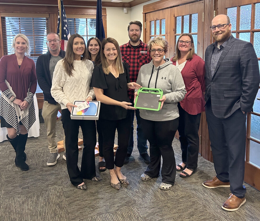 The Iron Mountain-Kingsford Kiwanis Club recently donated an iPad to Shannon Wilcox for her son, Brantlee. From left, in front are Amber Johnson, Kiwanis; Hillari Runsat, Kiwanis president; and Shannon Wilcox, mother of the child who received the iPad. In back are Kiwanis members Dawn Caruso, Jason Sullivan, Emily Maule, Tristan Summers, Michelle Bal and Russ Kassin.