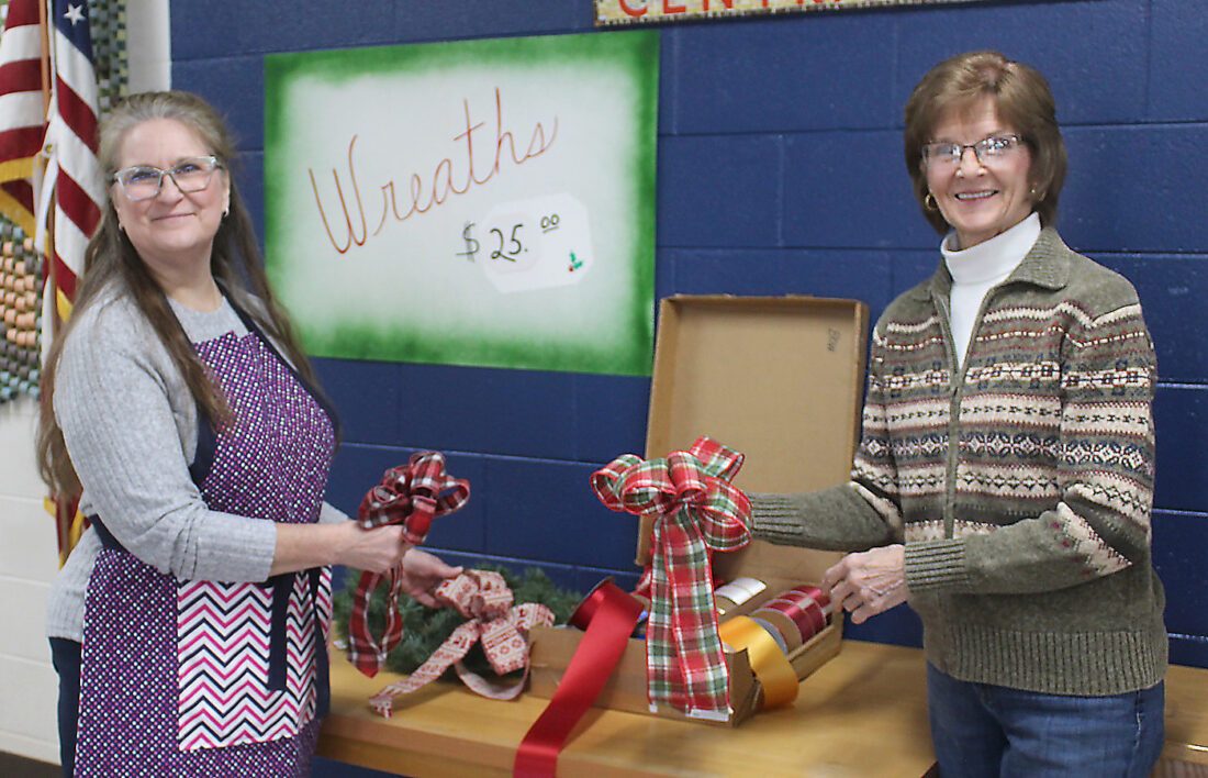 The Holy Spirit School of Norway will host its 39th-annual Craft Show this weekend. Show hours are 10 a.m. to 4 p.m. Saturday and 10 a.m. to 3 p.m. Sunday. More than a hundred tables of displays run throughout the classrooms, hallways and gymnasium of the school at 201 Saginaw St. in Norway. Items for sale will include woodcrafts; quilts; afghans; pebble, wine bottle and wire art; jams and jellies; honey; maple syrup; bakery; knitted and crocheted pieces; candles; several types of handmade jewelry; Christmas decor; and much more. Representatives from Rada knives will be on site. The kitchen will be open throughout the show serving hot beef, chicken and dressing and barbecue sandwiches, Coney dogs, french fries, nachos, popcorn, bars and beverages. Christmas cookies will also be sold by the dozen. Event coordinator Rose Gianunzio shows Catherine Menghini a selection of ribbon to customize her evergreen wreath. The wreaths are a fundraiser for the school. (Terri Castelaz/Daily News)