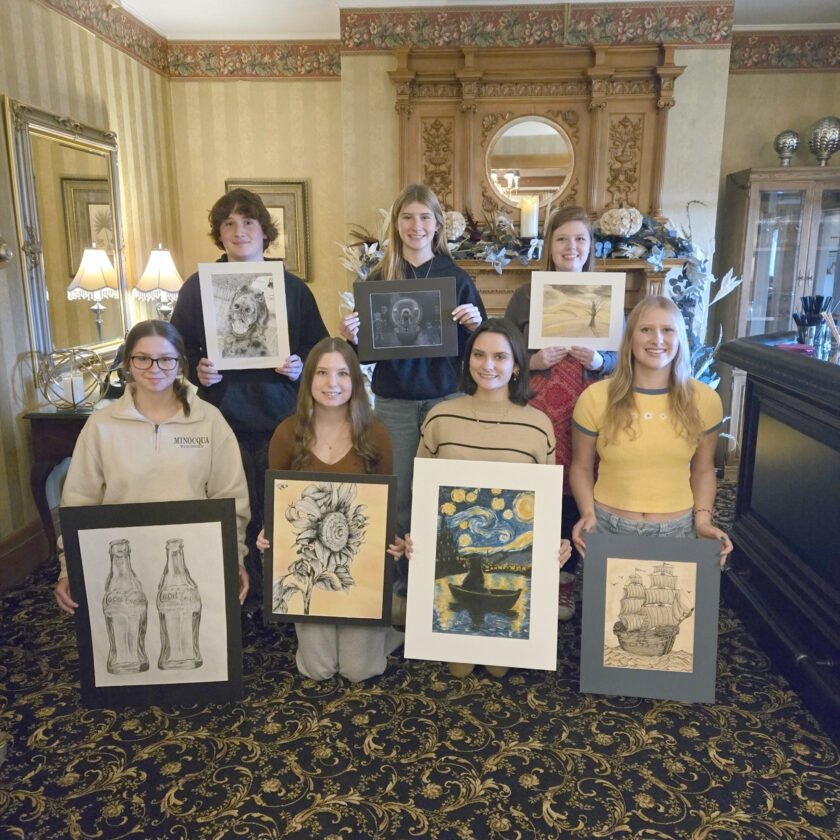 The Art Student Association recently had its first lunch of the 2025-26 school year at the Chippewa Club in Iron Mountain to honor its selected students. Participants were joined by local artist Erica Land and she did some Día de los Muertos — Day of the Dead — crafts with the artists while explaining the history and cultural importance of the day. From left, in front are Bella Ochs, Niagara, Wis.; Cady Brown-Norman, Kingsford; Lindsey Lewandowski, Iron Mountain; and Laurel Johnson, West Iron County. In back are Jacob Collins, Norway; Naomi Millan, Florence, Wis.; and CJ Johnson, Goodman-Armstrong Creek, Wis. (Submitted photo)