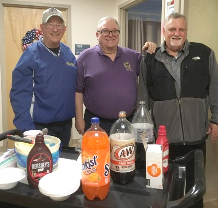 The Iron River Knights Of Columbus, Council 2300, recently hosted its final Black Cow event of the year at the Oscar G. Johnson Veterans Administration Medical Center in Iron Mountain. Volunteers served root beer floats (black cows), sundaes and treats to 40 veterans and staff. The Knight of Columbus said it's always a very special pleasure serving veterans. Volunteers from left are Chairman Sir Knight Tim Peruzzi, resident “Ranger” and Knight Mark Picard.