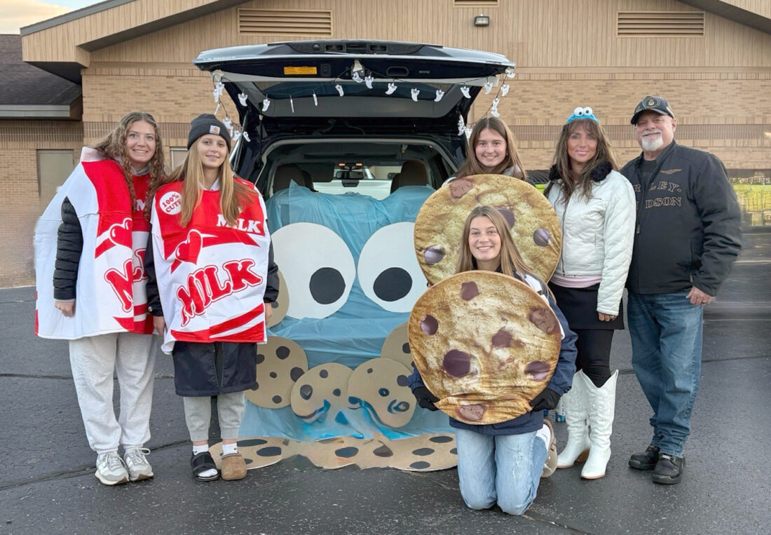 Members of the Norway High School Youth Advisory Committee took part in the PTO’s annual Trunk or Treat event to pass out candy to trick-or-treaters. The students decorated their trunk with a fun Cookie Monster theme, complete with costumes as cookies and milk, bringing smiles to local children and families. From left are YAC members Ella Wojtowicz, Kara Stanchina,Jessa Rossler and Tori Trudeau, advisor Tami Nelson and husband Bob Nelson. (Submitted photo)