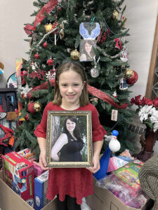 Madelynn Elizabeth Lequia displays a photo of her aunt, Beth Murray, in front of the Salvation Army’s Angel Tree. Murray’s family and friends continue to keep her memory alive by donations made in her honor each Christmas. (Contributed photo)