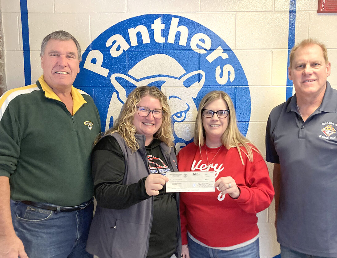 The Niagara, Wis., Knights of Columbus Council 2847 has donated to the special education department at the Beecher-Dunbar-Pembine School District. The funds were raised during the Knights of Columbus annual Tootsie Roll Drive. The Tootsie Roll Program provides health care, learning, and quality of life opportunities for children, teens, and adults with disabilities. Grants are offered primarily to public and private agencies that focus on improving the quality of life and providing health care and related services benefiting those with disabilities. From left are Knight Andy Herman, B-D-P School District teachers Stacy Kaiser and Angie Suther, and Grand Knight Bob Burton. (Contributed photo)