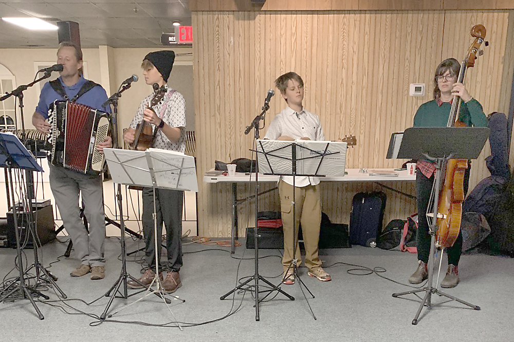 - The Majority Finn — featuring Pasi Lautila and his wife, Meg, and two sons — entertain the crowd at the local Raja Ryhma organization’s annual Pikkujoulu celebration. (Submitted photo)