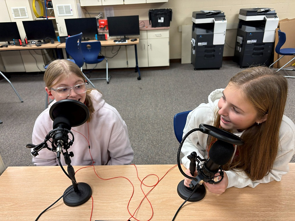 Kendal Burkland and Emilee Temrowski do a podcast in class.