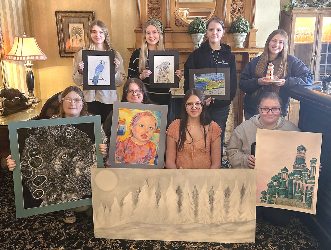 The Art Student Association met Tuesday for the third Artist of the Month luncheon of the 2025-2026 school year at the Chippewa Club in Iron Mountain. Local oil painter Stephen Wysocki was the featured artists. He painted seven-minute portraits of the students, while they practiced drawing a portrait from life. Students honored include, from left — in front are Chloe Clements, West Iron County School District; Alizabeth Richtig, Breitung Township Schools; Lauryn Dwight, Goodman-Armstrong Creek School District; and Tessa Vicenzi, Iron Mountain Public Schools; in back are Brooke Bruemmer, School District of Niagara; Fynnly Ketola, Forest Park School District; Alissa Tobias, School District of Florence County; and Anna DeBidart, Norway-Vulcan Area Schools. (Contributed photo)