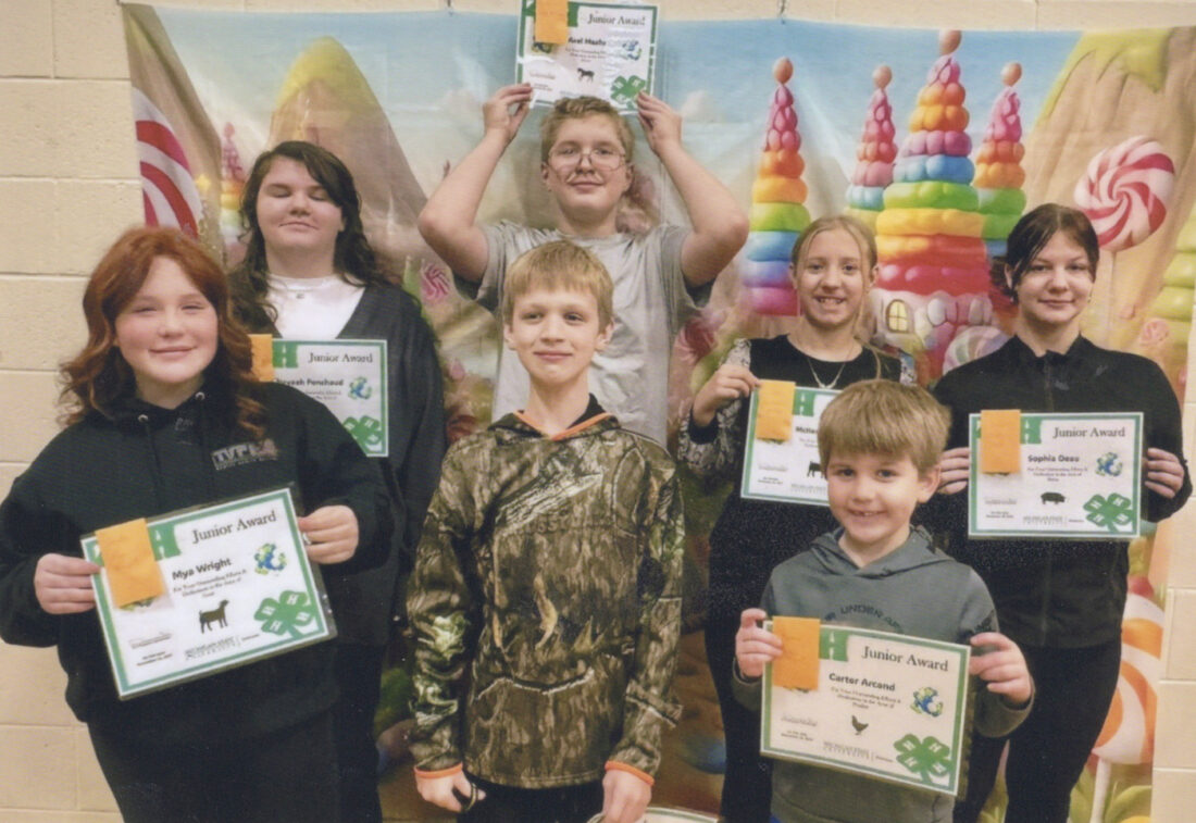 - Junior awards given at the Dickinson County 4-H banquet went to, from left, in front, Mya Wright, Isaiah Wright and Nolan Arcand, standing in for Carter Arcand; in back, Nevaeh Ponchaud, Axel Maahs, McKenna Miller and Sophia Deau. (Submitted photo)