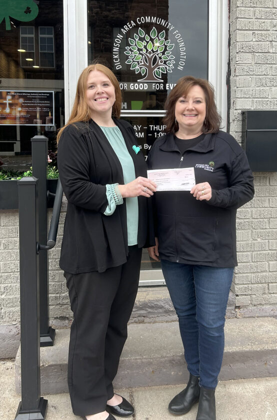 The Dickinson Area Community Foundation, along with affiliates Crystal Falls Area Community Foundation and Norway Area Community Foundation, recently awarded a $500 Community Impact Grant Award to assist in acquiring breastfeeding essentials kits for new mothers in Dickinson and Iron counties. The funds were made possible with a matching grant from the Pasahow Family Fund. The Dickinson- Iron District Health Department senior WIC and breastfeeding counselor Amber Grassinger, left, accepts the check from Tamara Juul, DACF director. The foundation's mission is to enhance and strengthen communities now and for generations to come. For more information on available funding, contact Juul at 906-774-3131 or go to the foundation website at www.dickinsonareacf.org.