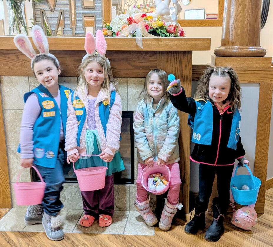Girl Scout Troop 5118 recently decorated Easter eggs and distributed them to residents at Maryhill Manor in Niagara, Wis. From left are Malia Mosher, Michelle Poquette, Isabella Flynn and Braelynn Tobey.