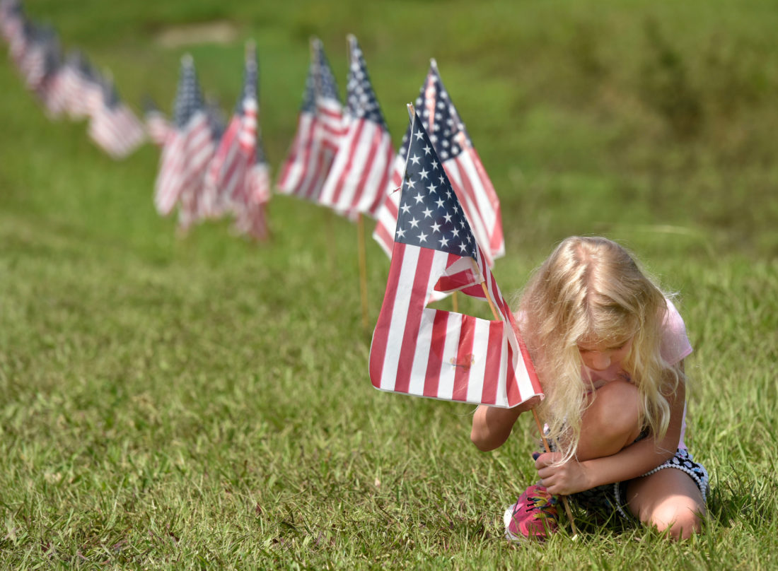 AP Photo Luna Chiarello, 6, helps her mother Silver put American flags out along the road in front of their family business, Robinson's Auto Parts, Tuesday in Orange Mills, Fla., the day before Independence Day.