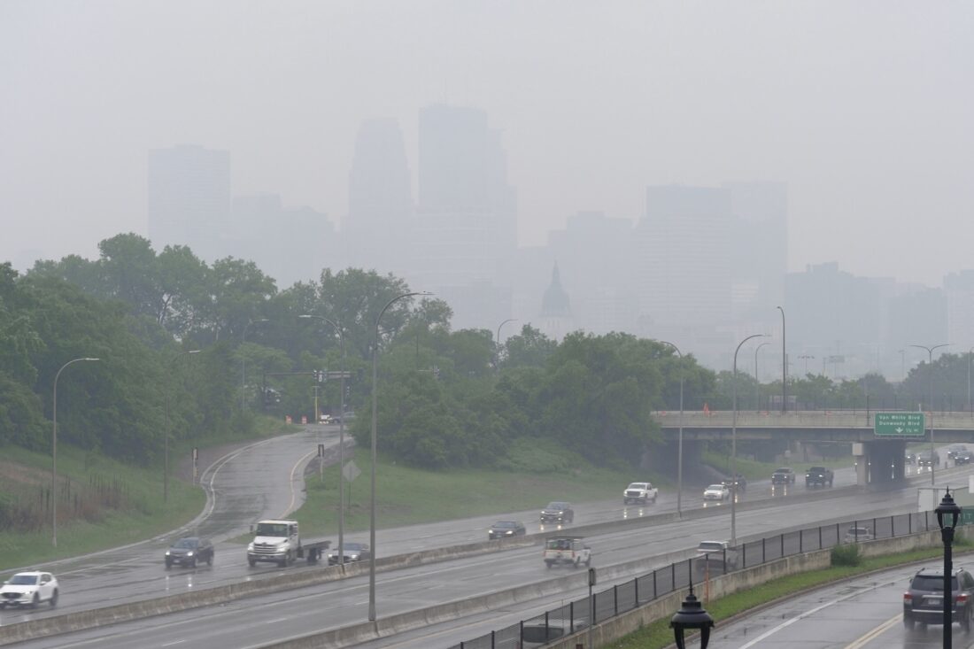 Smoke from wildfires burning in Canada and rain obscures the downtown skyline of Minneapolis, Minn., on Tuesday, June 3, 2025. (AP Photo/Mark Vancleave)