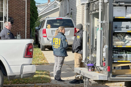 FBI agents gather outside a home in a Dearborn, Mich., neighborhood on Friday. (AP Photo/Mike Householder)