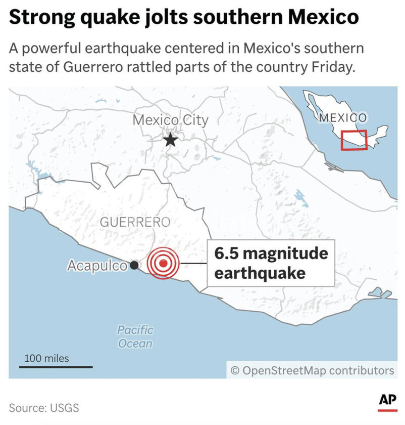 The earthquake had a magnitude of 6.5 and its epicenter was near the town of San Marcos in the southern state of Guerrero near the Pacific coast resort of Acapulco, according to Mexico ‘s national seismological agency. There were more than 500 aftershocks.