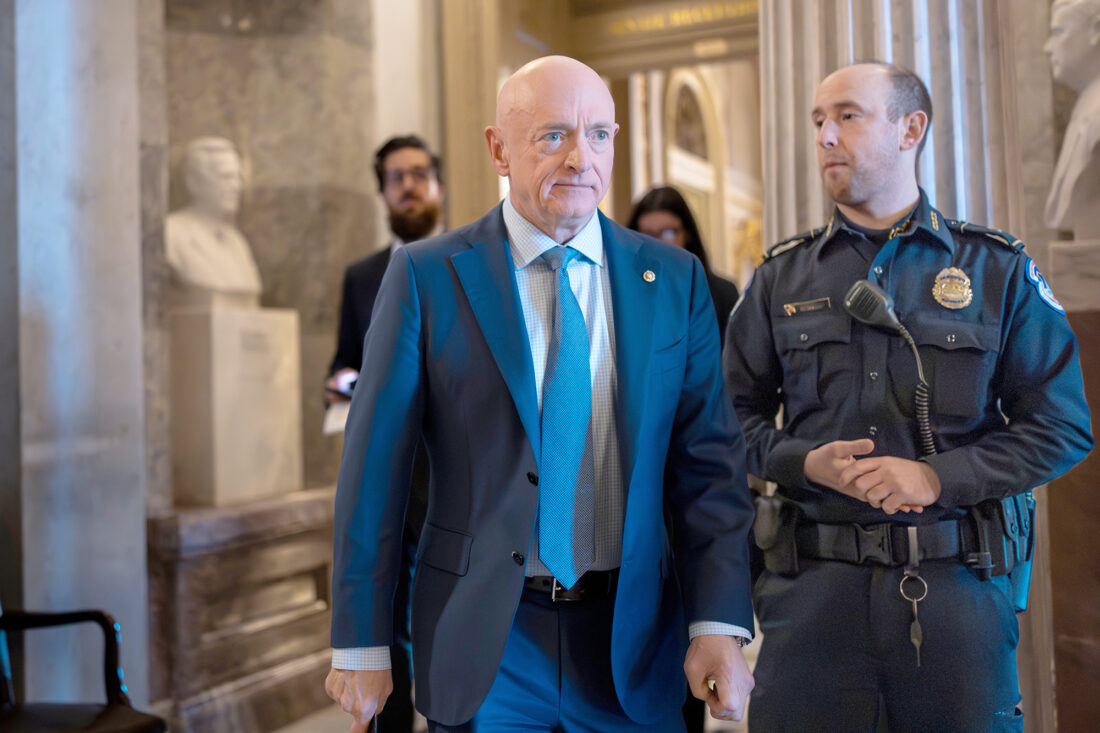 Sen. Mark Kelly, D-Ariz., exits the Senate chamber Monday after speaking out against Defense Secretary Pete Hegseth's efforts to censure him over his participation in a video that called on troops to resist unlawful orders, at the Capitol in Washington. (AP Photo/J. Scott Applewhite)