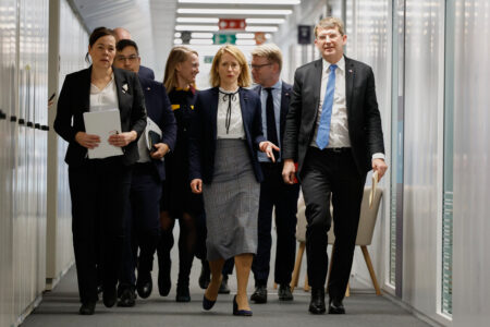 European Union foreign policy chief Kaja Kallas, center, walks with Minister for Foreign Affairs and Research of Greenland Vivian Motzfeldt, left, and Denmark's Defense Minister Troels Lund Poulsen, right, prior to a meeting at EU headquarters in Brussels, Monday.(AP Photo/Geert Vanden Wijngaert)