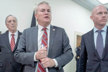 House Oversight Committee Chairman James Comer, R-Ky., flanked by Rep. Andy Biggs, R-Ariz., left, and Rep. William Timmons, R-S.C., speaks to reporters Monday after a closed-door deposition with Ghislaine Maxwell, the former girlfriend and confidante of sex trafficker Jeffrey Epstein, at the Capitol in Washington. (AP Photo/J. Scott Applewhite)