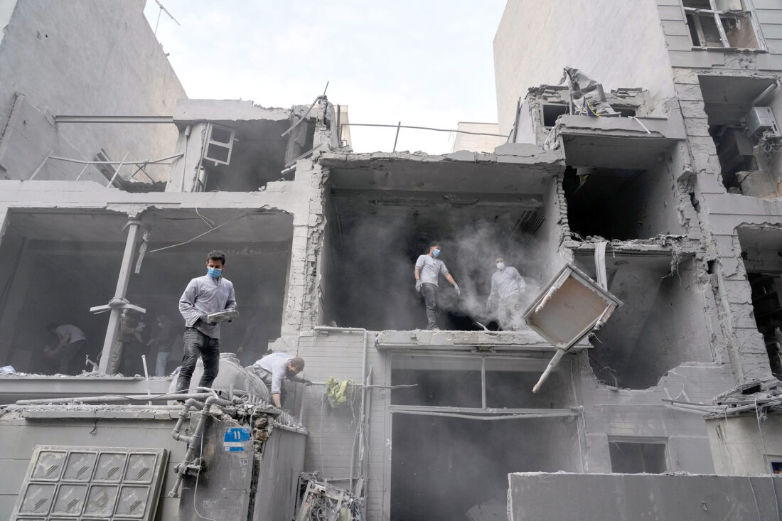 Several strikes hit central Israel and the Tel Aviv area, where they caused damage at 23 sites and sparked a small fire. Magen David Adom, Israel’s rescue service, released video showing a large crater in a street and shrapnel damage to an apartment building.