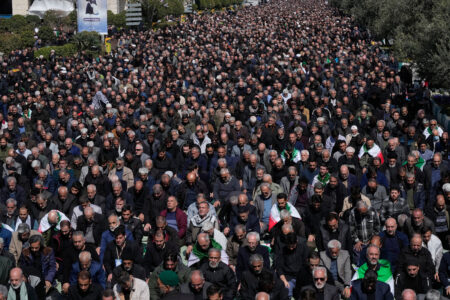 Iranians attend Friday prayers in the courtyard of the Imam Khomeini Grand mosque in Tehran, Iran, Friday.(AP Photo/Vahid Salemi)